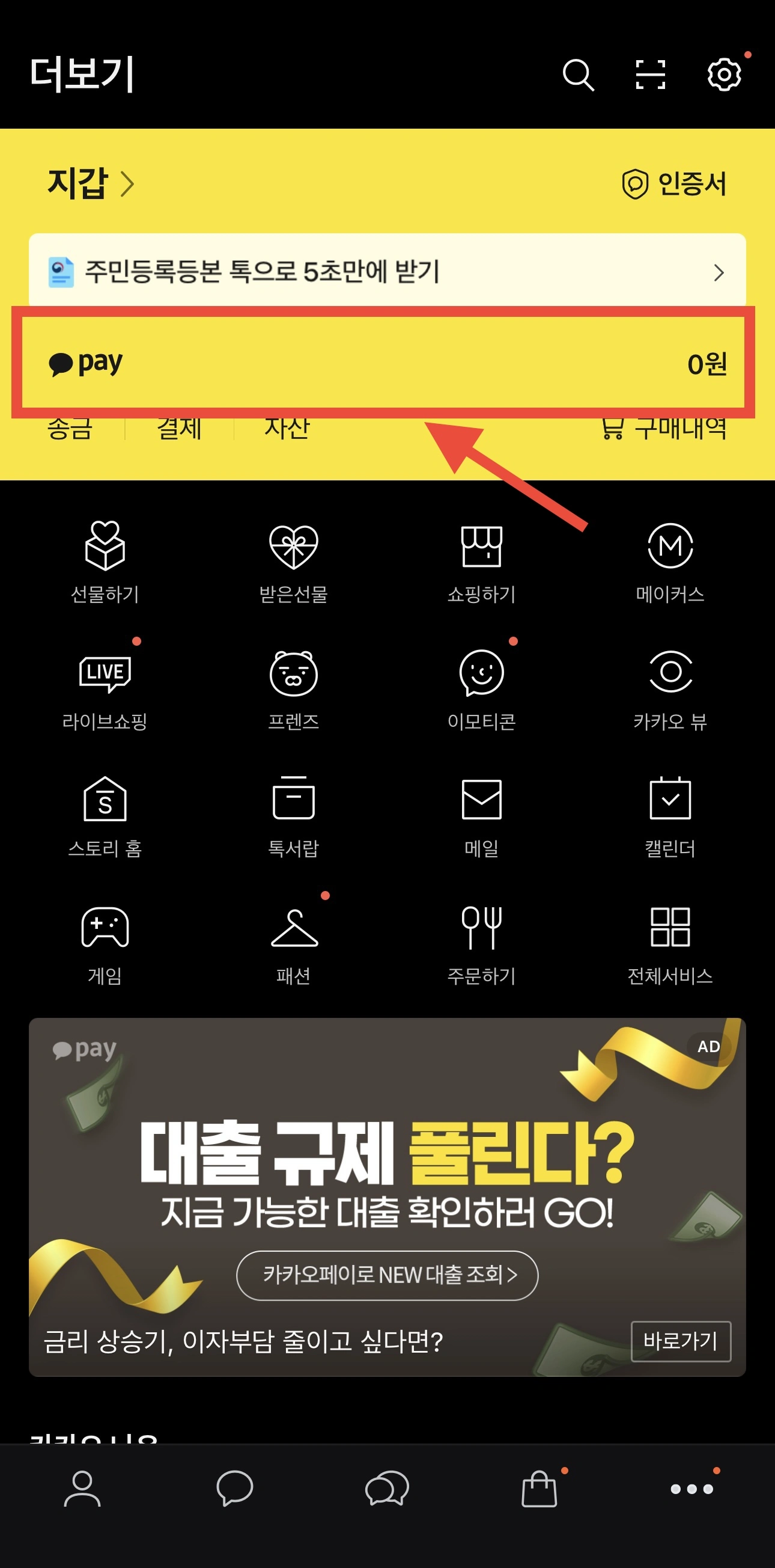 - 카카오톡 실행 후 우측 하단 …으로 진입해 네모칸 표시된 카카오페이를 누른다